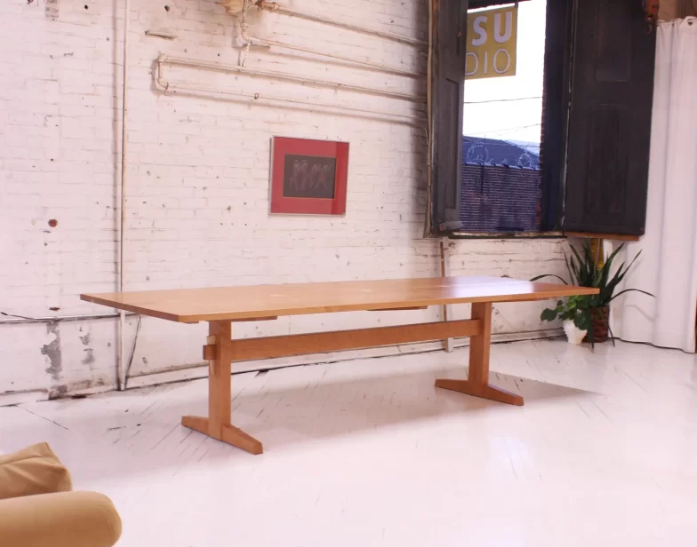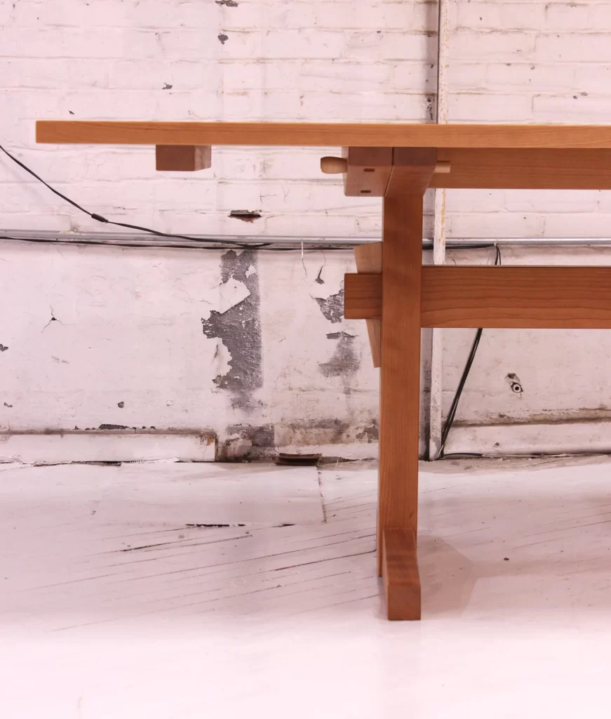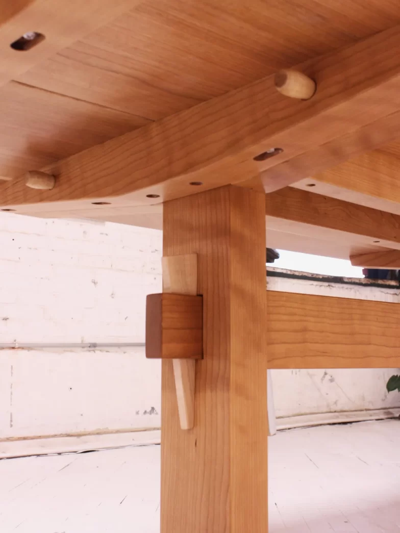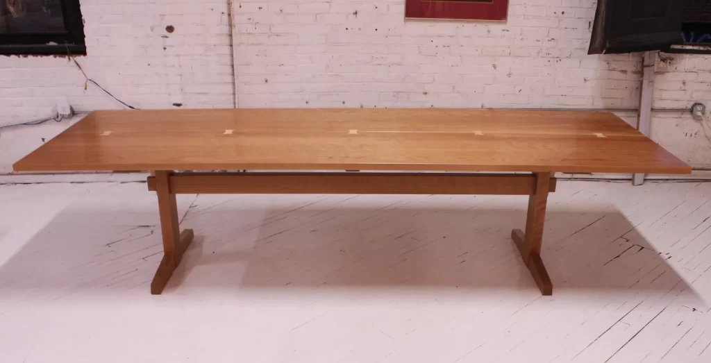 This Japanese inspired cherry table is built to be taken apart and reassembled in minutes. The pins secure the top to the base and the wedges secure the legs together. Very rigid and durable design, inspired by Japanese craftsmanship. The table photographed here measure 120″ long x 42″ wide x 30″ tall.