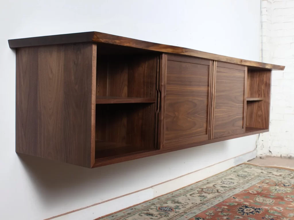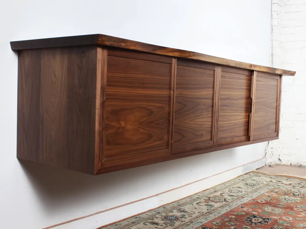Live edge walnut wall mounted credenza This walnut floating credenza/server measures 80″ wide x 22″ deep x 20.5″ tall. It’s attached to the wall via a French cleat. Four sliding doors with adjustable shelves in the outer bays and upholstered drawers in the middle bays. Share this Project